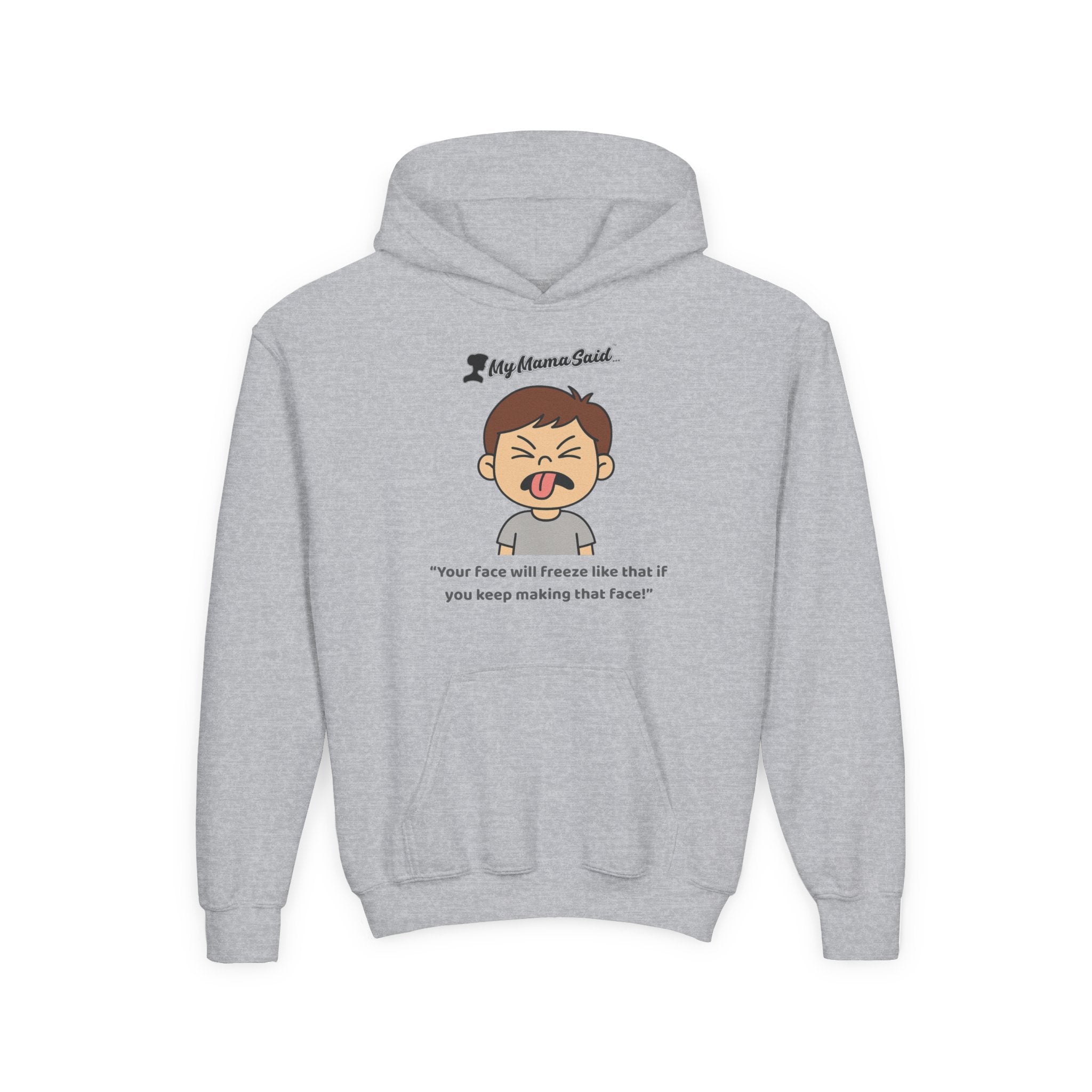 Whether you were sticking out your tongue, scrunching up your nose, or making your funniest face, Mama always had the same response: “Your face will freeze like that!” This cozy My Mama Said™ kids hoodie brings that timeless moment to life with a silly cartoon expression that kids love and parents instantly recognize.